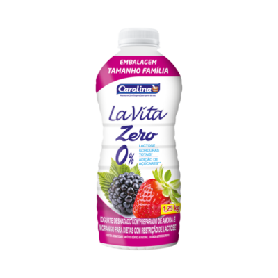 Ingredientes: Leite desnatado e/ou leite desnatado reconstituído, preparado de amora e morango (água, amido modificado, polpas de amora e morango, aroma idêntico ao natural de amora, conservante sorbato de potássio INS 202, acidulante ácido cítrico INS 330, aroma idêntico ao natural de morango e corantes artificiais azorrubina INS 122 e azul brilhante FCF INS 133), amido modificado, enzima lactase, fermento lácteo, estabilizantes: gelatina (INS 428) e pectinas (INS 440) e mix de edulcorantes: aspartame (INS 951) e acessulfame de potássio (INS 950). ALÉRGICOS: CONTÉM LEITE E DERIVADOS. NÃO CONTÉM GLÚTEN. CONTÉM FENILALANINA. DIABÉTICOS: CONTÉM GLICOSE E GALACTOSE. CONSUMIR PREFERENCIALMENTE SOB ORIENTAÇÃO DE NUTRICIONISTA OU MÉDICO.
